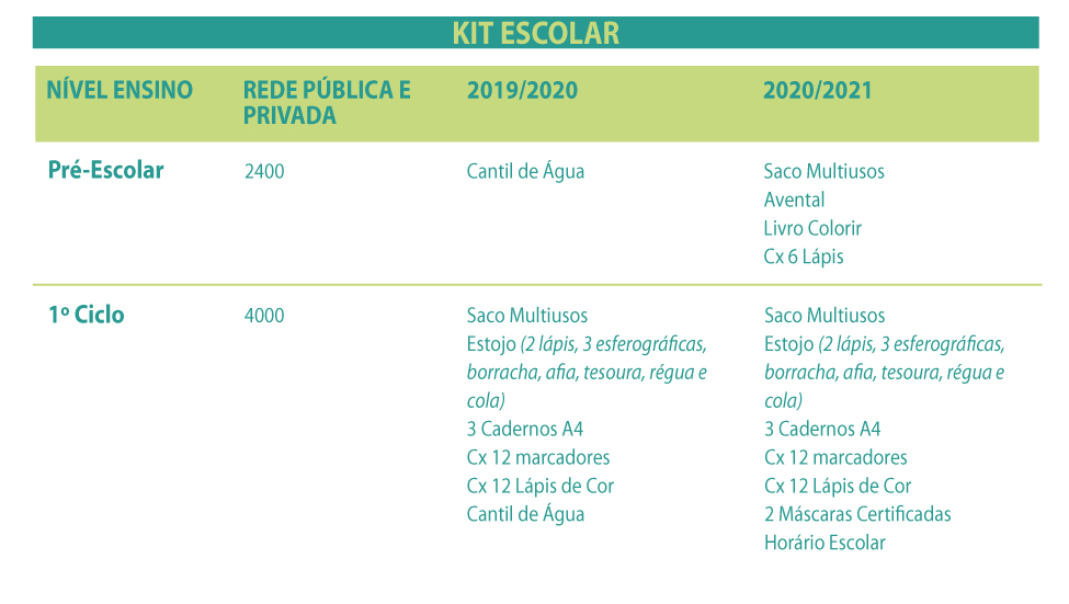 No início do ano letivo 2020/2021 foram entregues cerca de 6400 kits de material escolar aos alunos do Pré-Escolar e do 1º Ciclo, num investimento superior a 47.000,00 €.