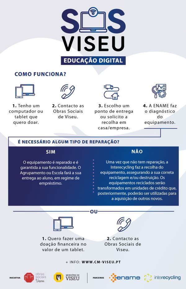 Chama-se SOS Viseu – Educação Digital e pretende reunir empresas, setor social e sociedade civil num objetivo comum: entregar equipamentos informáticos aos alunos que não dispõem de um computador que lhes permita participar no ensino à distância. O projeto, coordenado pela IPSS Obras Sociais Viseu, conta com a Ename e a Interecycling como parceiros.